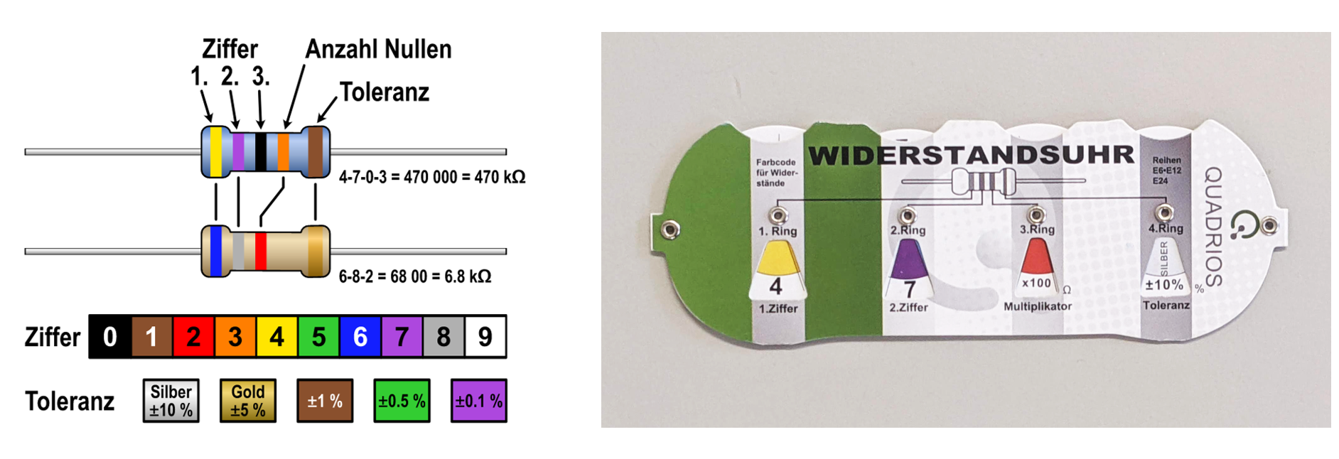 Für Widerstände werden die nominellen Werte und die Toleranzen durch farbcodierte Ringe angegeben.